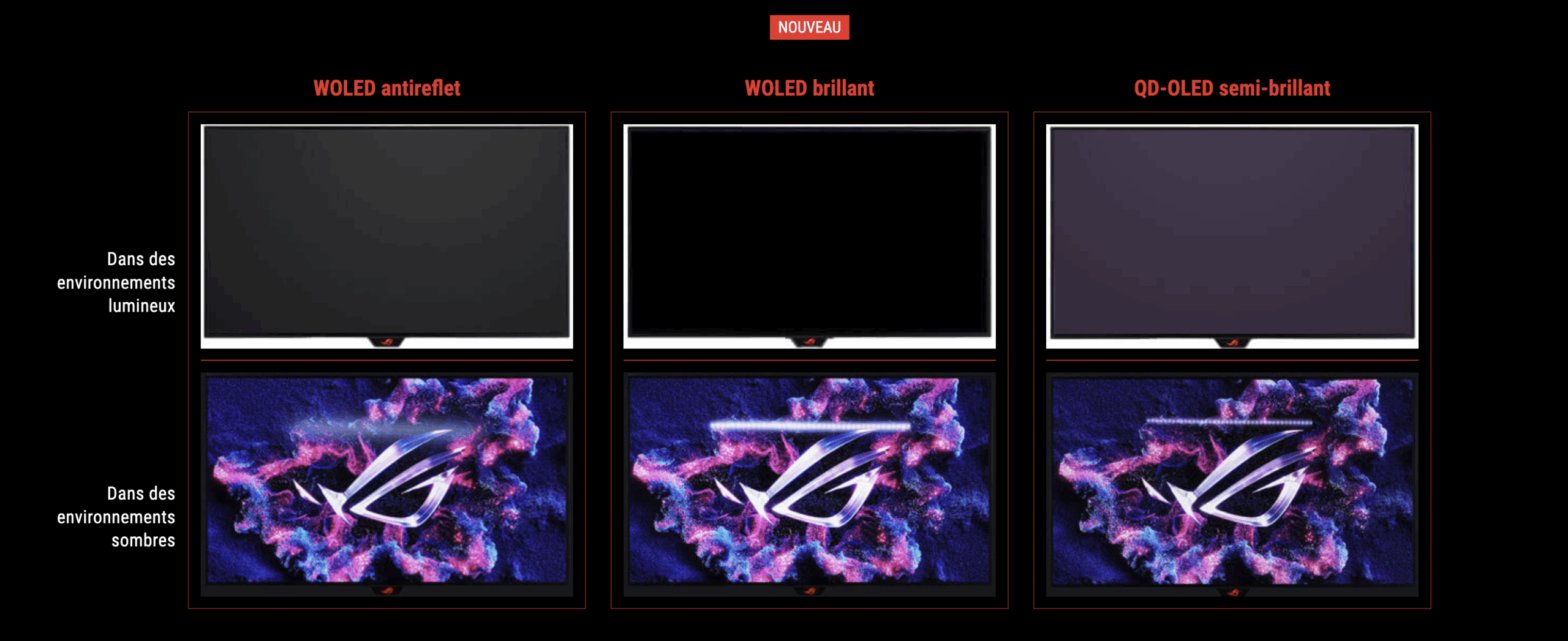 Ici, avec le nouveau revêtement TrueBlack Glossy, ROG propose un noir « pur » retirant de fait la grande majorité des défauts de ce type de moniteurs. L’écran est aussi plus lumineux que les équivalents dans cette gamme de prix, permettant des pics à 1151 cd/m2 en HDR et environ 400 en moyenne sur du SDR.