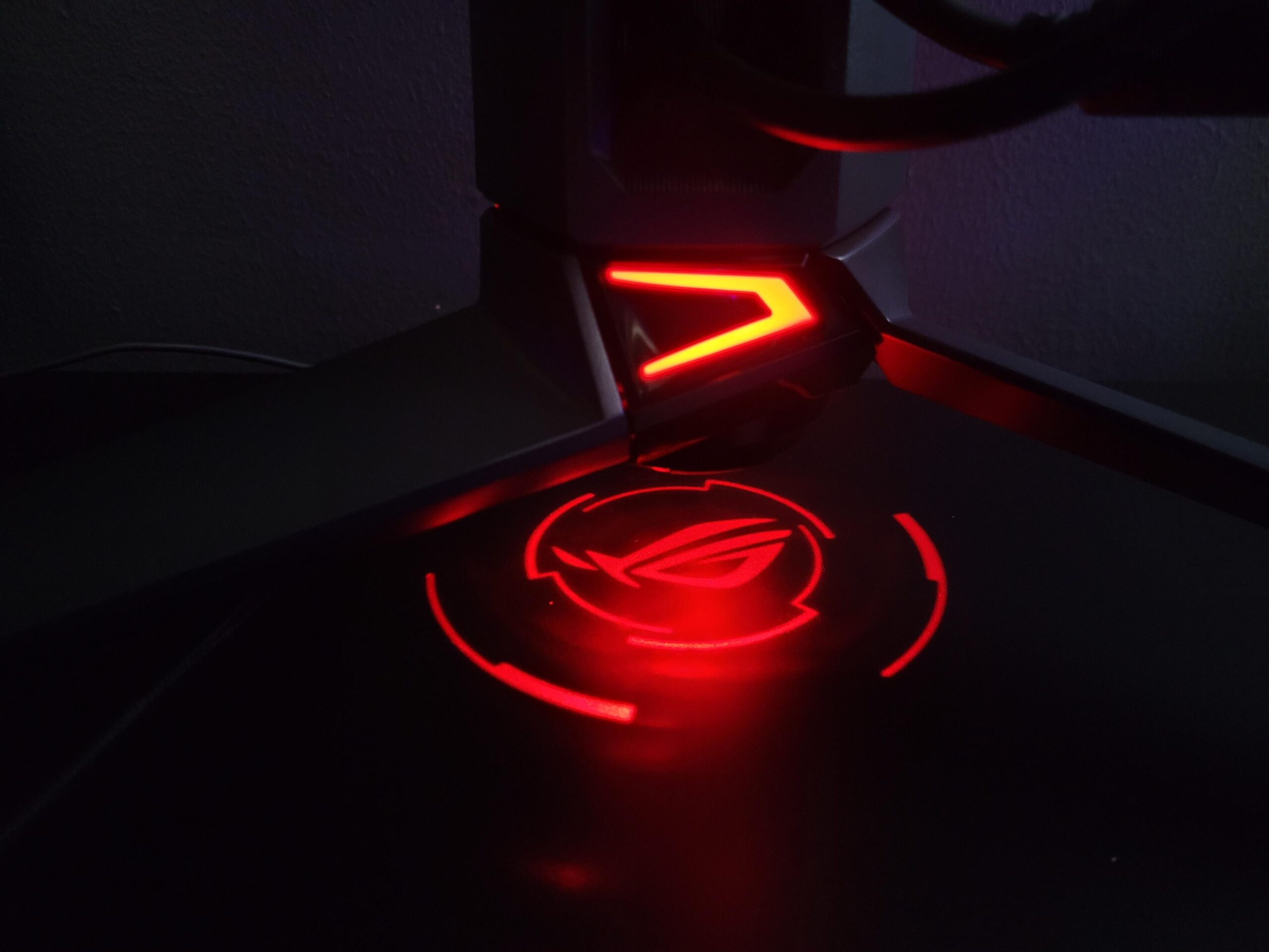 ROG conserve ici le pied en branche souvent utilisé sur les moniteurs OLED. Bien que le moniteur reste compatible VESA 100×100 si vous souhaitez l’accrocher au mur où le fixer sur un bras, le pied d’origine a la particularité d’être éclairé d’une lumière à sa base permettant de projeter le logo de la marque sur votre bureau.
