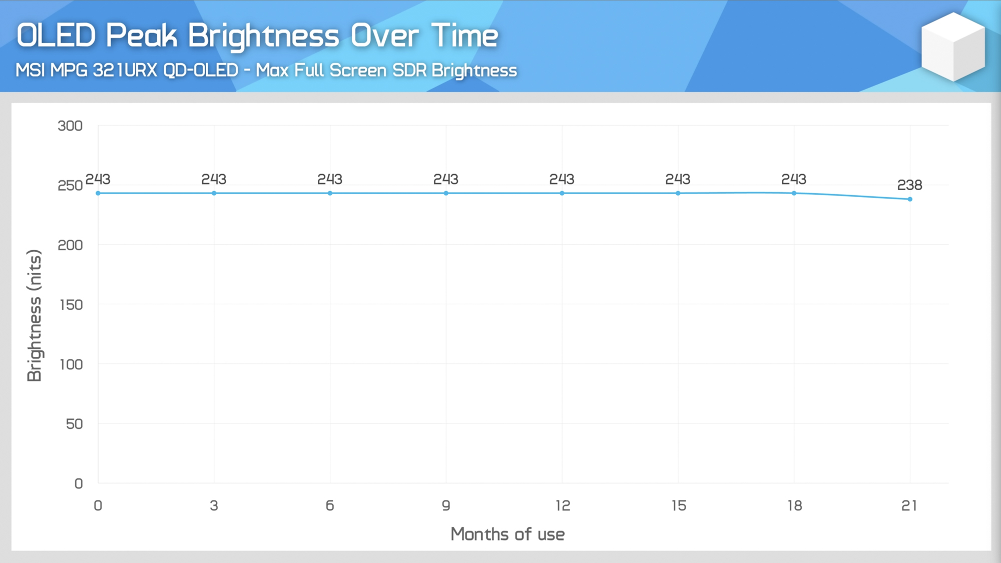 – Luminosité : Malgré l’usure visible, la perte de luminosité globale est ridicule : seulement 2 % (passant de 243 à 238 nits) après 5000h.