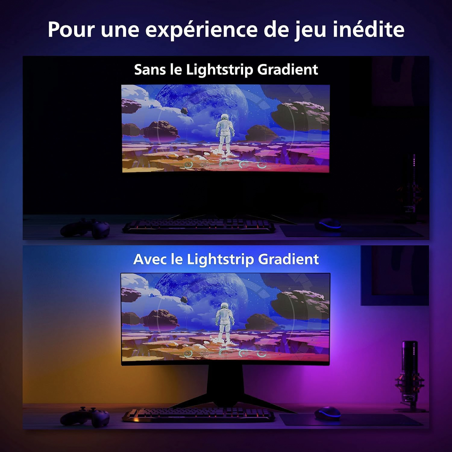 Le bandeau Gradient se fixe simplement à l’arrière du moniteur grâce aux supports fournis. Une fois branché, il suffit de connecter le Pont Hue à votre réseau Wi-Fi et de lancer l’app Hue Sync pour profiter immédiatement d’une expérience visuelle immersive.