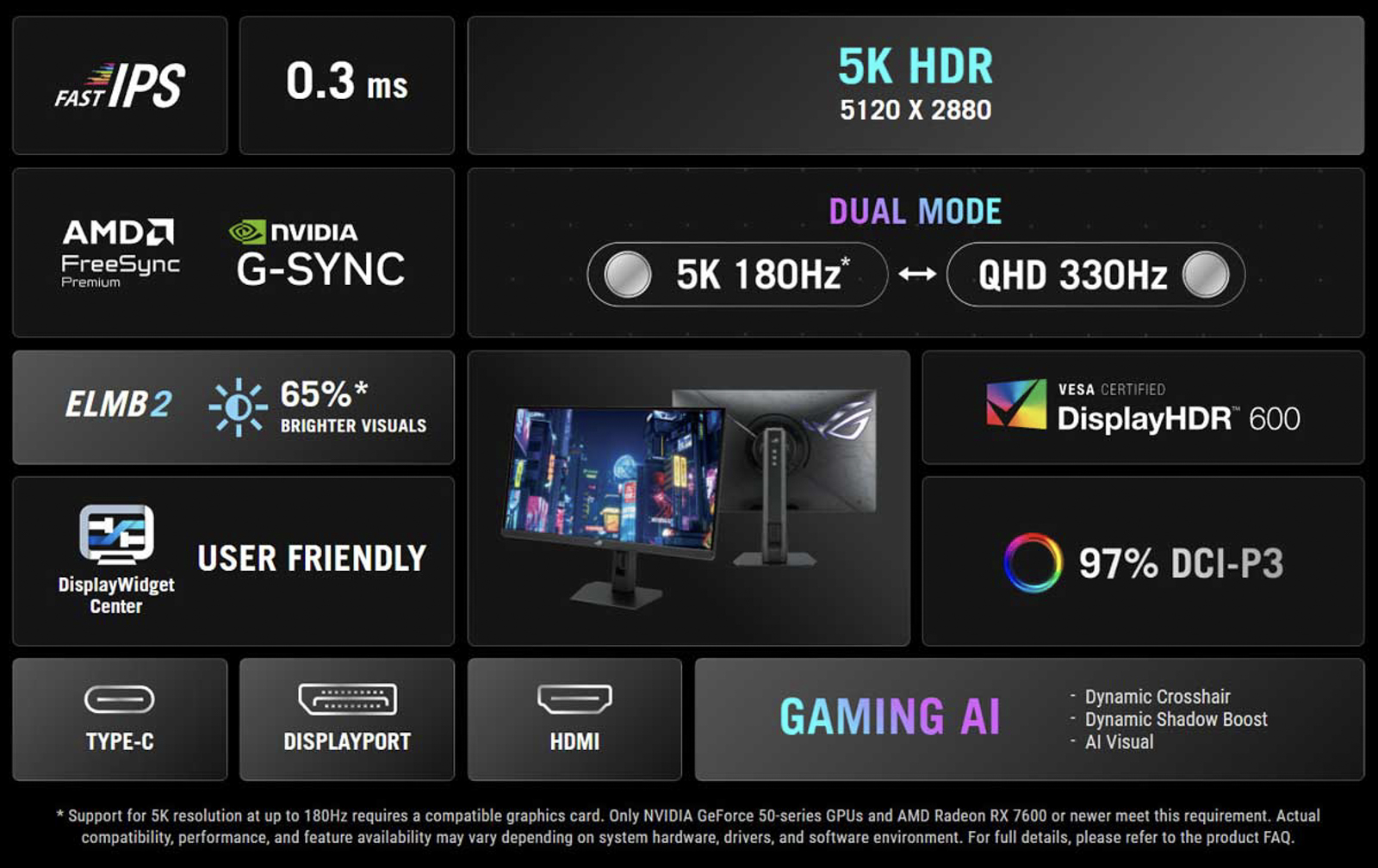 Attention toutefois : pour exploiter le 5K à 180 Hz, ASUS précise qu’une carte graphique de dernière génération (type RTX 50-series ou RX 7600 minimum) est indispensable.