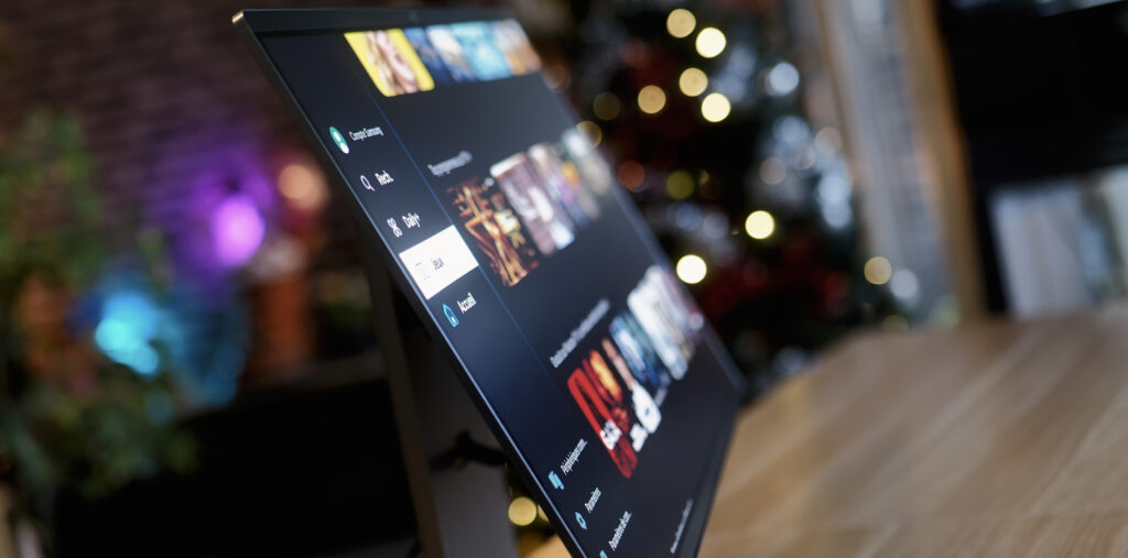 Une wecam 4K et deux micros sont présents en haut de l’écran, ainsi que 2 haut parleur 10W.