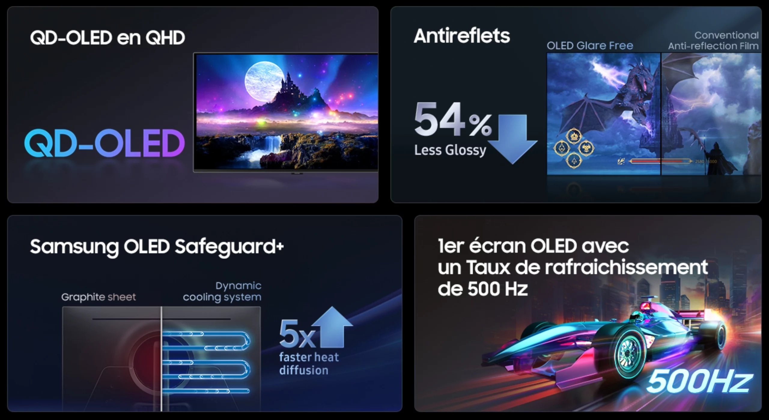 Le cœur du G60SF repose sur la technologie QD-OLED (Quantum Dot OLED) maison de Samsung Display, qui profite d’un certain nombre d’avantages vis-à-vis du concurrent LG Display et de sa technologie WOLED. Cependant, une clarification technique s’impose.