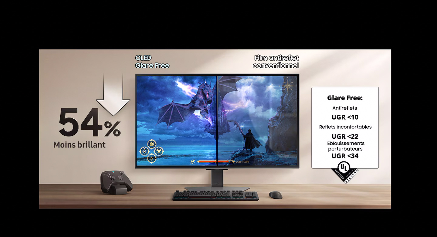 L’objectif technique est de réduire les réflexions spéculaires (l’effet miroir) sans sacrifier la densité des noirs, talon d’Achille habituel des traitements mats face aux dalles glossy. D’après les données constructeur, ce film réduit les reflets de 54% par rapport aux films anti-reflets conventionnels, bien que les puristes de l’image préféreront toujours le glossy pour le « pop » des couleurs et le côté plus précis/net de l’image.
